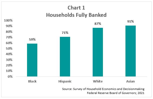 Longstanding disparities in banking access continued to persist in 2021. The percentage of Black and Hispanic households reporting being fully banked lagged significantly behind white and Asian households (Chart 1).