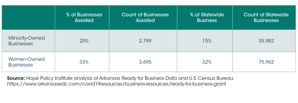 Although Arkansas recognized that small businesses were struggling and a grant program with a minority-set aside is a helpful intervention, the program’s outcome shows there were gaps leaving some of the most impacted businesses behind.